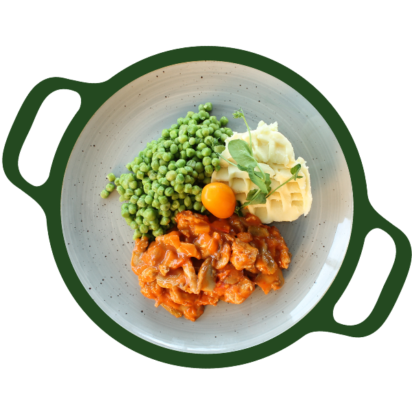 Vegetarische kipstukjes in stroganoffsaus, doperwten en romige aardappelpuree